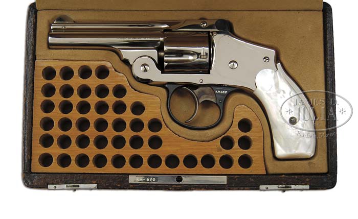 *FINE CASED SMITH & WESSON 38 NEW DEPARTURE 4TH MODEL DA REVOLVER FROM THE KARL MOLDENHAUER COLLECTION. SN 141389. Cal. 38 S&W. Nickel finish with 3-1/4″ keyhole shape bbl and half moon front sight with caliber marking on left side. Mounted with smooth 2-pc pearl grips. Left rear web of trigger guard is marked in white paint “KM620” which is the inventory number from the famous Karl Moldenhauer Collection that was sold by the Richard Bourne Auction Co. in about 1980. Accompanied by a wonderful brown pigskin covered, hinged lid leather case with buff colored chamois lining that is recessed in bottom for the revolver and has a serpentine-shaped cartridge block with holes for 44 cartridges. Inside lid is embossed in gold “J.B. CROOK & CO. / GUNS & PISTOLS / 1180 BROADWAY, N.Y.” Case has a mortised nickel plated lock in front with sliding nickel plated latches on each end of front. Top of mortised lock is also marked in white paint with the matching Karl Moldenhauer inventory number. Although this revolver was made in fairly large quantities it is rare to find them cased and in “as new” condition such as we have here. PROVENANCE: Karl Moldenhauer Collection; Jack Du Blou (1986); Robert Howard Estate Collection. CONDITION: Extremely fine plus, all matching except grips which are unnumbered. Overall retains virtually all of its brilliant orig factory finish with only a faint cyl line; trigger guard & bbl latch retain virtually all of their bright factory blue and the trigger about all of its orig case colors, lightly faded; grips are sound with great fire & color. Mechanics are crisp, brilliant shiny bore, appears to be unfired. Case is completely sound with moderate external wear; interior is crisp & clean with light soil around trigger guard and bbl latch areas. Altogether a beautiful & rare set. 4-45503-1 JR160 (3,000-4,000)