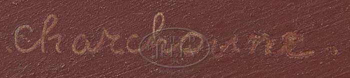 SCHOOL OF SERGE CHARCHOUNE (Russian, 1888-1975) ABSTRACT COMPOSITION. Oil on masonite scene shows a colorful piling of rectangles having a outlined cityscape in the background. Signed lower left. Housed in a black modern frame. A cutout Sotheby’s catalog with this painting is attached to reverse indicating the provenance was Midcontinental Fine Arts, Chicago. SIZE: 24″ x 28″. CONDITION: Very good. 9-23605 (1,000-1,500)