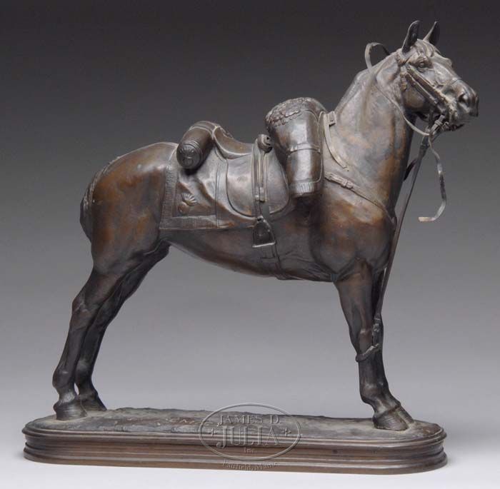 EMMANUEL FREMIET (French, 1824-1910) STANDING HORSE. Depicting a bridled horse at the ready with military accoutrements. A stylized oval plinth and signed at the midpoint of the base “E. FREMIET”. SIZE: 12” h x 13” l. CONDITION: Minor damage to bridle, detached from body, otherwise original patina and surface, very good condition. 9-74622 MD (1,500-2,500)