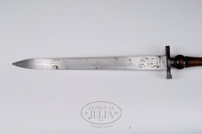 GERMANIC OR CONTINENTAL STYLE PLUG BAYONET. Very early plug bayonet with 13-9/16″ spear point blade, 20″ overall length, 1-1/4″ at ricasso with thick steel handguard with one flat tip quillion to be used for a hammer and the other quillion a screwdriver blade. Blade is gently tapered with primary edge sharpened and a 4″ sharpened false edge. Handle is turned hardwood with tapered tang and an iron ferrule at handguard with an iron pommel cap. These bayonets were intended for multiple use tools as a fighting knife, as an entrenching tool and after the sgl shot musket was fired to be inserted into the bore and used as a bayonet. CONDITION: Fine to very fine. Blade is clean with a cleaned gray metal color and fine pitting, shows evidence of light sharpening. Handguard, ferrule & pommel cap are a dark brown patina. Handle is sound with a few dings and retains a hand worn patina. 4-32971 JR427 (1,500-2,500)