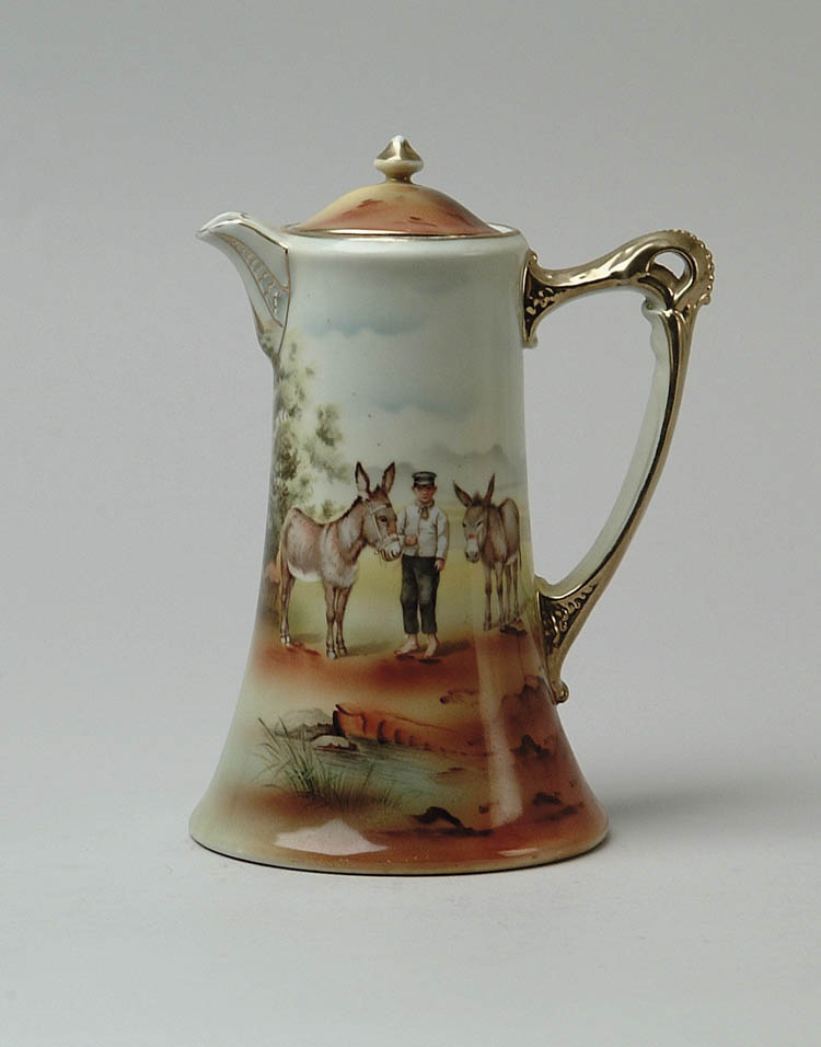 ROYAL BAYREUTH CHOCOLATE POT. Decoration of a boy with three donkeys. SIZE: 8 1/2″ tall. CONDITION: Very good to excellent. 5-67055 (200-300)