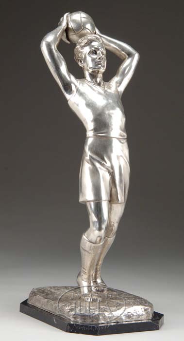 WHITE METAL FIGURE OF A SOCCER PLAYER. Silver colored figure of a young man holding a soccer ball in both hands over his head. He is in the midst of a “throw in”. Signed on base “R. Lepec”. Comes with a black slate base which is separate. SIZE: 24” h x base 7-1/2” w x 9-1/2” d. CONDITION: Very good. 9-70782 (1,000-1,500)