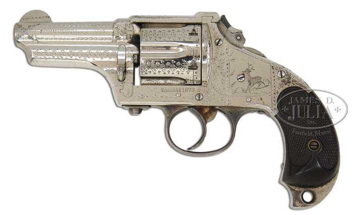 ENGRAVED MERWIN & HULBERT POCKET ARMY DA REVOLVER. SN 8362. Cal. 44 WCF (44-40). Nickel finish with 3-5/16″ bbl, integral front sight and top strap of the later production. It has 6-shot cyl with conventional flutes and birdhead grip with skull cracker buttstrap, mounted with checkered hard rubber grips. Hammer has a folding spur. Left side of bbl has the 2-line Hopkins & Allen address & patent numbers. Right side of frame has the Merwin & Hulbert company name & address and “POCKET ARMY”. Left side of frame is marked “CALIBRE 1873 WINCHESTER”. Revolver is typically engraved with foliate & floral and geometric patterns with a deer on left sideplate. Engraving extends over sides of bbl and bbl lug and on cyl on the lands between the flutes. According to Flayderman’s Guide to Antique American Firearms there were approx. 9,000 Pocket Army revolvers produced in the 1880s in three configurations with most of production in single action versions. Merwin & Hulbert were distributors, not manufacturers, who purchased patents and contracted various companies for production. Their handguns were produced by Hopkins & Allen. The Merwin & Hulbert design was superior to other handguns of the period with their ease of unloading & ejecting empty casings with the push of a button and simple full forward. Returning the bbl and cyl to battery allowed the cyl to be reloaded through the sliding loading gate in the right recoil shield. Unfortunately Merwin & Hulbert came to the scene long after Colt and to some extent, Remington, were already in production and widely distributed. With the lack of government contracts and a weak distribution system they simply could not compete. A majority of Merwin & Hulbert revolvers were sold in Mexico and are rarely found today with high orig finish. PROVENANCE: Dick Reyes (1984); Robert Howard Estate Collection. CONDITION: Extremely fine, all matching including grips. Overall retains virtually all of its strong orig factory nickel with some minor flaking on top strap. Mechanics are crisp, bright shiny bore. 4-45336 JR99 (4,000-6,000)