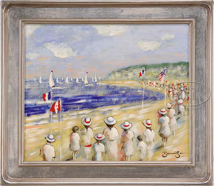 JOHN WALTER BEAUVAIS (European, 1942-2004) SUMMER INTERNATIONALS. Oil on canvasboard scene shows a sailboat race off a C-shaped beach lined with spectators in white with colorful hats. Four flags fly on poles including the U.S. flag. Housed in a modern silver gilt wood frame. SIZE: 20″ x 24″. CONDITION: Very good. 9-94092 (1,500-2,500)
