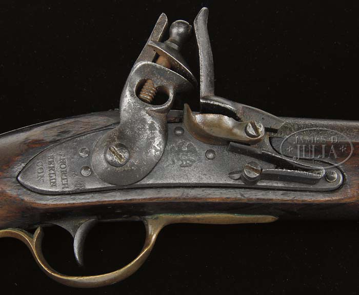1811 TRANSITIONAL NORTH FLINTLOCK PISTOL WITH MODEL 1812 MODIFICATION (WICKHAM BAND). SN NSN. Cal. 73. 8-3/4″ Round bbl, stamped at breech with “P” and “8”. Tang strap extends to brass umbrella type butt cap. Lock with movable brass pan is stamped with small eagle in front of broad round-bodied cock, and “S. North Berlin Con” on tail of plate. Trigger guard and sideplate are brass. Sideplate does not have extension, typical of the Model 1808, however pistol has been fitted with 1808 type belt hook, with stud retaining hole in stock. Pistol has been factory fitted with 1812 iron double strap band, as designed by M. T. Wickham, as part of the conversion. Fore-stocks are shortened approx 2″, and a small retaining stud has been added. Pistol has swell tipped hickory ramrod. Approx 550, of the 1150 pieces made, have this conversion. PROVENANCE: Robert Howard Estate Collection. CONDITION: Good. Iron parts are a dark gray to brown patina, with extensive fairly deep pitting at breech end of bbl. Lock is lightly pitted. Cock, more so, and slightly loose. Marks are good, eagle thinning. Brass tone is a dark golden brown. Stock is fine with nice hand worn patina over minor marks. Belt hook added by Dan Cullity. Ramrod looks to be from an 1805 Harpers Ferry. 4-45522 MGM101 (7,500-12,500)