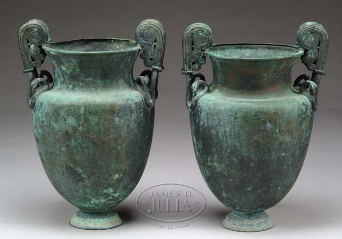 FABULOUS PAIR OF BRONZE GARDEN URNS. 19th Century or earlier. Footed urns in tapering form with wide flaring top and flat rim have Romanesque scrolled handles terminating in double swans heads. Wonderful verdigris patina. Probably European. An exceptional pair. SIZE: 24-1/2” h x 17” at widest. CONDITION: Very good, one has 1” split on rim. 9-71350 (7,000-9,000)