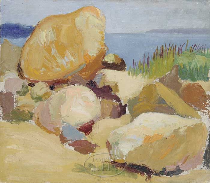 ATTRIBUTED TO HARRY EDWARD STINSON (American 1898-1975) TWO WORKS. Both unframed, unsigned. One on board; the other canvas on board. Each showing a coastline; one with sandy shoreline with poles and boat, the other with rocks on sand and grasses. SIZE: 14″ x 16″ – 14″ x 17-1/2″. CONDITION: Good. 9-26138 (600-800)