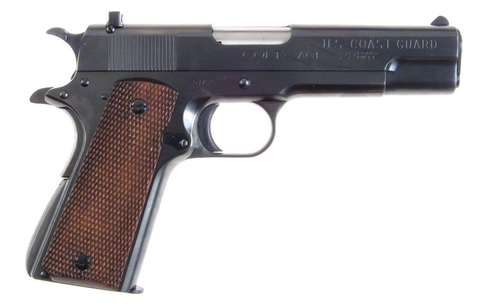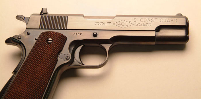 *COLT ACE PISTOL. Cal. 45. SN 5102. This is a beautiful US Coast Guard Colt Ace that has been expertly restored. Gun shows to be 99%+, has factory letter showing it went to the commanding officer of the US Coast Guard Depot, Curtis Bay, Maryland on June 20th, 1934 with 200 guns in shipment. CONDITION: Metal of this pistol retains 99% finish and is orig to this gun. Bbl assembly is perfect inside and out with the proper fiber spacers on the follower spring. Magazine shows new and is proper 2 tone Colt Ace magazine. Grips just have the slightest high point edge wear on them, but are also in excellent condition. Although restored this is a very nice example of a very rare secondary military arm. 4-58347 BK88 (3,500-6,500)