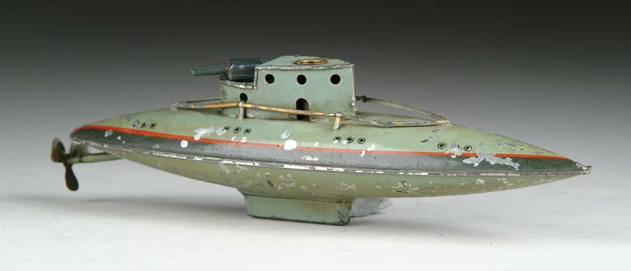 GERMAN WIND-UP SUBMARINE. SIZE: 9 1/2” l. CONDITION: Missing two soldered tail pieces; otherwise working and good. WP 1-3758 (150-300) Auction: Advertising, Toy & Doll - Spring 2005 Please Note: All prices include the hammer price plus the buyer’s premium, which is paid by the buyer as part of the purchase price. The prices noted here after the auction are considered unofficial and do not become official until after the 46th day. |