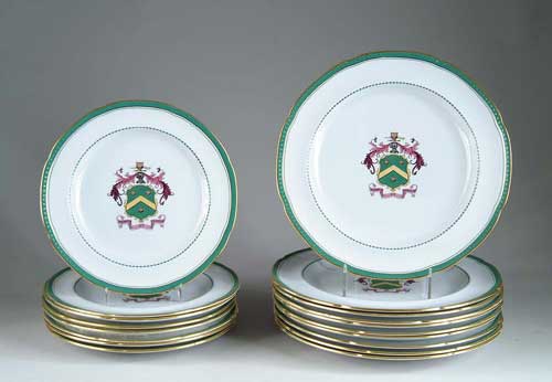 FORTY-EIGHT COPELAND SPODE PLATES WITH FAMILY CREST. Green border with stars on a white background with center Fitch family crest having green and gold shield, lion with sword and rose colored leaves and banner. Twenty-four 10-1/4” plates and twenty-four 8-3/4” plates. CONDITION: Very good. 9-98340 (400-600)