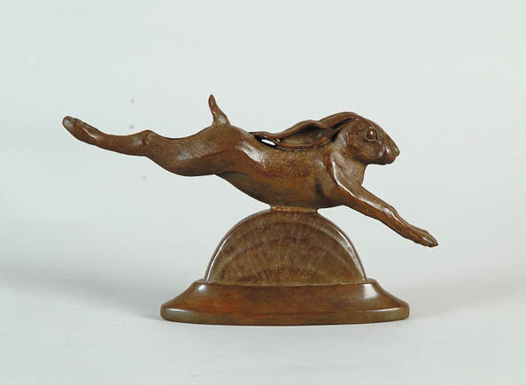 STEVE KESTREL (American, 1947-) LEAPING RABBIT. Brown patina bronze of a leaping jackrabbit. Figure rests atop bronze half circle on an oval base. Signed “S. Kestrel 6/21”. BRONZE: 6” h x 10” l. CONDITION: Very good. 9-95511 (300-500)