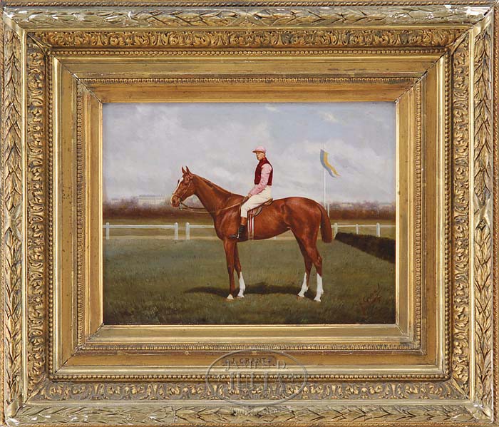 J GRANT (English, 19th/20th Century) PORTRAIT OF A RACE HORSE. Outstanding oil on wood panel scene shows a large brown horse with jockey atop on a groomed grass lawn with white rail fence and buildings and trees beyond. Housed in a gesso decorated period frame. Signed lower right and dated “90”. SIZE: 10-1/2″ x 13-3/4″. CONDITION: Very good with some inpainting. 9-95574 (1,500-2,500)