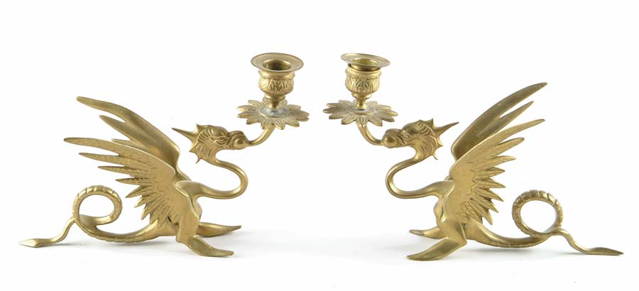 PAIR OF BRASS DRAGON CANDLESTICKS. Figural dragon form holds candle cup from stem in mouth, each having separated brass bobeches. SIZE: 6-1/2” h x 9” l. CONDITION: Very good. 9-97766 (100-150)