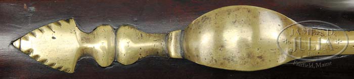 KETLAND MARKED NEW ENGLAND STYLE MILITIA TYPE FUSIL. SN NSN. Cal. 62. 44″ Barrel with bayonet lug on bottom 1-1/2″ from muzzle is fitted with brass sights, and is unmarked. “W. Ketland” marked lock with integral pan, bridled friction frizzen, and tall serpentine cock is line border engraved, with rebated tail. Cherry stock with deeply fluted comb, extends to within 3-1/4″ of muzzle, with brass tip. Four brass ramrod pipes hold iron trumpet head ramrod. Other brass fittings include one piece trigger guard with large arrowhead finial, heavy shaped buttplate with geometrically filed top tang, and large oval brass escutcheon at grip. Sideplate is scroll outlined. Mr. Howard’s notes indicate that he acquired this item from Herb Glass. PROVENANCE: Robert Howard Estate Collection. CONDITION: Good. Bbl and lock retain overall pleasing dark plum brown patina. Surface of lockplate is frosted overall. Brass is a fine golden brown patina. Stock shows an old oil refinish, sharp edges slightly rounded, but has a great look. Lock and bbl appear to have been reconverted to flint. Quality of workmanship and aging is exceptionally fine. 4-45399 MGM118 (3,000-5,000)