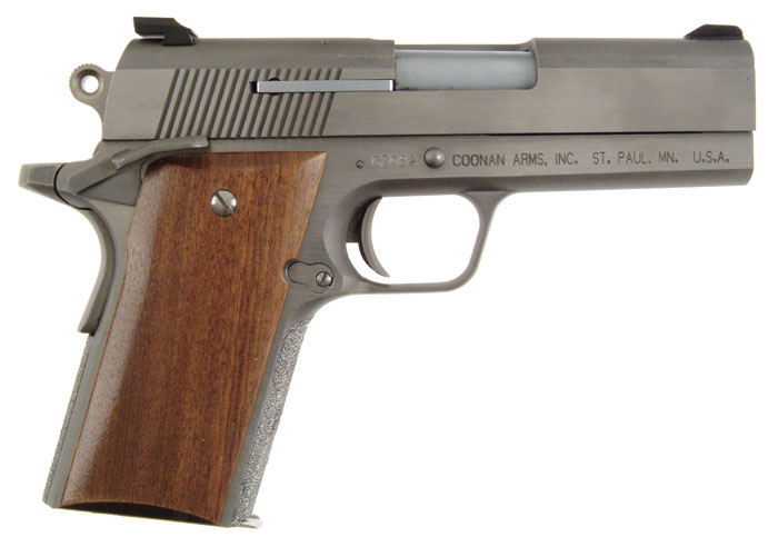 *COONAN STAINLESS STEEL SEMI-AUTO PISTOL. Cal. 357 Mag. SN C2084. All stainless compact size 1911 type pistol with 3-3/4” bbl, smooth walnut grips with stippled front & back straps. It has extended beavertail type grip safety with extended slide lock & thumb safety and has MMC low profile rear sight with Millet front sight. Accompanied by three magazines, a set of Allen wrenches & tools, a Coonan jacket patch & Fiberglas carrying case. CONDITION: As new, may have been fired, but if so very little. 4-58381 JR292 (1,000-1,500)
