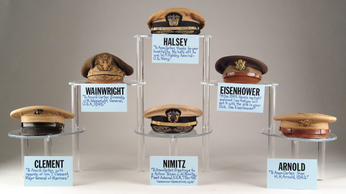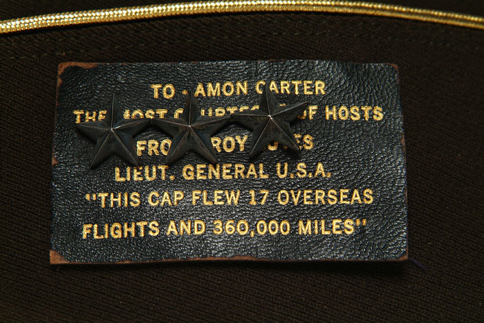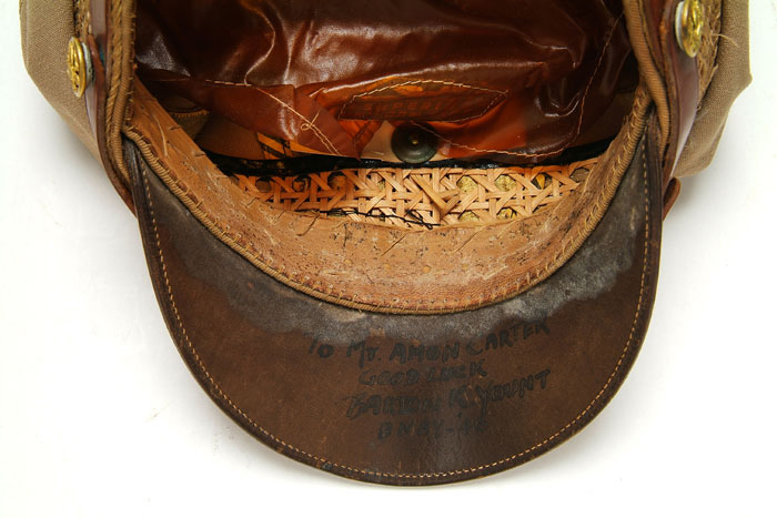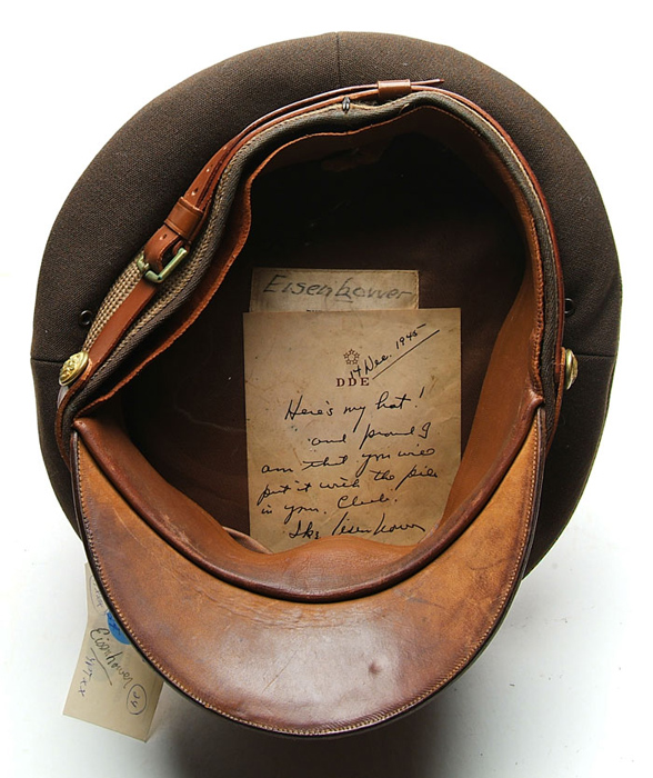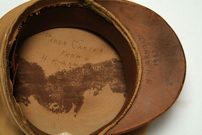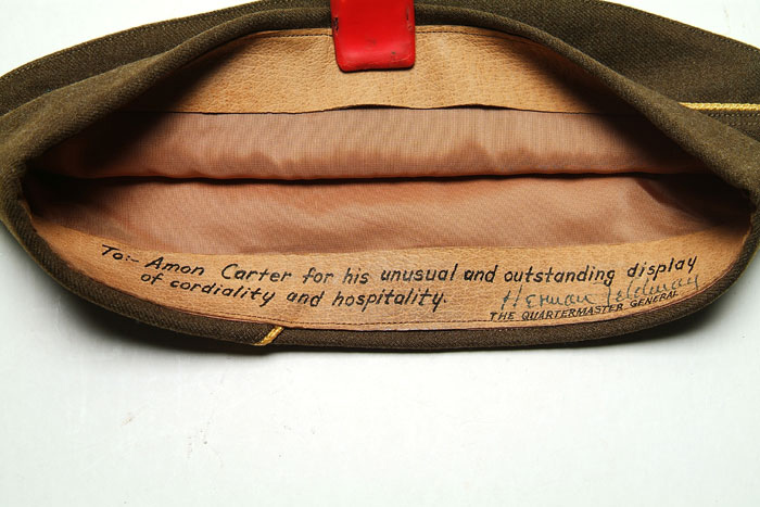 AMON GILES CARTER SR. COLLECTION OF US WWII HIGH RANKING GENERAL AND ADMIRAL’S HATS. Amon Giles Carter, Sr. was born in 1879 of humble means in a one-room log cabin in Crafton, Texas. By 1923 he had risen to president and publisher of the Fort Worth Star-Telegram, and five years later he was the director and part owner of the Aviation Corporation, later to be a major part of American Airlines. He was highly influential in the development of the discovery of oil in North Texas and persuaded many oilmen to move to his home city of Fort Worth. By 1935 his first successful oil well was drilled in New Mexico. Carter was an avid collector of Western art, among other things, and in 1961 the Amon Carter Museum was opened in Fort Worth. One of his most unusual collections, officer’s hats of prominent generals and admirals of World War II, is now offered by James D. Julia Auction Company. This collection grew to 24 examples from Carter’s habit of exchanging fine quality Stetson hats for the uniform caps of the various commanders, his friends and visitors to his famous “Shady Oaks” ranch and estate near Fort Worth. 1) EISENHOWER, DWIGHT D., FIVE-STAR GENERAL, U.S. ARMY. Olive-drab visor cap labeled “Extra quality Ayres & Smith, London. On label in ink “Eisenhower Gen of A”. Included is a piece of personal notepaper bearing five stars and the initials DDE with the inscription “14 Dec 1945. Here’s my Hat! And proud I am that you will put it with the pile in your Club. Ike Eisenhower.” CONDITION: Slightly crumpled, but generally fine. 2) KENNEY, GEORGE C., GENERAL, U.S. AIR FORCE. Summer-weight gabardine 50-mission-style crush visor cap by Brooks Bros., New York. Initialed “G.C.K.” on sweatband. Signed “Gen. George C. Kenney U.S. Air Force” on the underside of the visor. Kenney commanded the 4th Air Force, the 5th Air Force, and the 5th and 13th Air Forces called the Far East Air Force, or FEAF. CONDITION: Cap is crumpled and stained in places caused by the bleeding of the sweat lining. 3) RICHARDSON, ROBERT E., GENERAL, U.S. ARMY. Summer-weight khaki covered visor cap “Fly-weighter by Lewis”, English manufacture. CONDITION: Excellent, like new. 4) NIMITZ, CHESTER W., FLEET ADMIRAL, U.S. NAVY. Fine quality cap of silk-like material, sterling silver and gold wash insignia with bullion oak leaves and acorns over felt-covered brim. Cap is a “Bancroft Zypher Navy” from the Haas Tailoring Co., Baltimore, MD. Nimitz’s calling card under the sweatshield is signed “Honolulu-Texas Bound, July 1943. To Amon Carter, Greetings to a fellow Texan. C. W. Nimitz, Fleet Admiral, USN, 7 Dec 46”. Nimitz was the overall commander of the combined U.S. and Allied Forces of the Central Pacific area. CONDITION: In fine condition with minor storage staining. 5) ARNOLD, HENRY H. (HAP), GENERAL OF THE AIR FORCE. Summer-weight khaki visor cap by an unknown manufacturer. Signed on the underside of the visor “H. H. Arnold 1942” and on the inside crown “To Amon Carter from H. H. Arnold 1942”. Arnold, 1886-1950, was the commander of the U.S. Army Air Forces in World War II and the only air commander to hold the five-star rank of “General of the Army”. CONDITION: Leather sweatband is partially detached and the top bears some staining from the protective liner; otherwise in very good condition. 6) HALSEY, WILLIAM FREDERICK “BULL”, FLEET ADMIRAL, U.S. NAVY. Summer-weight tan visor cap by N. S. Meyer, Inc., New York. Embroidered Naval cap device, with acorns and oak leaves on a felt visor. The inscription on the inside of the sweat protector reads “To Amon Carter. Thanks for your hospitality. My hat’s off to you. W. F. Halsey – Admiral, U.S. Navy”. Dated “5-26-44”. Halsey commanded the South Pacific area in 1942. Promoted to Commander and Chief of the Third Fleet and Five-Star Admiral in Dec. 1945. CONDITION: Fine condition indicating moderate wear. 7) HIS ROYAL HIGHNESS PRINCE BERNHARD OF THE NETHERLANDS. British-style General’s visor cap, red band and cloth covered visor. Embroidered Netherlands royal lion with legend below “Nederland”. Cap was made by “Walter Barnard & Son, 97 Jermeyn St., St. James’s, London”. A slip of wrapping paper containing a return address states “From H.R.H. The Prince of the Netherlands, c/o Netherlands Embassy, Washington, DC”. The Prince, a staunch anti-Nazi, was a pilot with the RAF from 1942 – 1944. In 1944 he became commander of the Dutch armed forces. CONDITION: Some damage to the left front of the brim either by abrasion or mothing; otherwise in good condition. 8) BROWN, R. GORDON, GENERAL, ROYAL PARACHUTE REGIMENT. Maroon Parachute Regiment beret marked “Kangol Wear Limited 1944”. A post-war, 19 April 48 note in Brown’s handwriting accompanies the beret stating “To Amon Carter of Fort Worth. This beret from North Africa, Normandy, Arnheim and the Rhine – the only respectable hat I have. Gordon Brown”. CONDITION: Moderate moth damage along the edge of the leather binding. 9) ROYCE, RALPH, MAJOR GENERAL, U.S. ARMY AIR CORPS. Crusher-style tan gabardine visor cap, made in Karachi, India. Originally ordered by General Pat Hurley and then given to General Royce in Cairo, Egypt. Royce claims it was his “favorite hat” as indicated in a note pinned to the inside of the hat. The front eagle ornament is woven with gold thread into the cloth. General Royce commanded the 1st Aero Squadron in World War I, all U.S. forces in the Middle East, was Deputy Commander 9th Air Force and Senior Air Officer afloat during the Normandy Invasion. CONDITION: Quite good with one moth nip and some wrinkling from storage. 10) YOUNT, BARTON KYLE, SR., LT. GENERAL, U.S. ARMY AIR CORPS. Summer-weight gabardine 50-mission-style visor cap by Superior Uniform Cap Co., Chicago, Illinois. Signed inside the visor “To Mr. Amon Carter. Good Luck. Barton K. Young, 8 May ’46.” General Yount, commander of various Air Corps training c