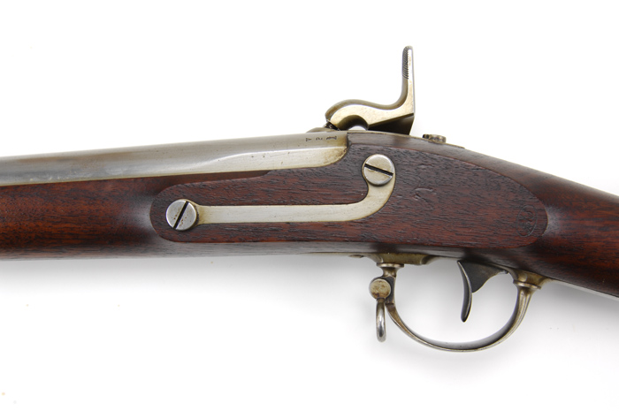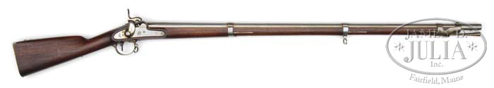 EXCEPTIONALLY HIGH CONDITION SPRINGFIELD MODEL 1842 MUSKET. SN NSN. Cal. 69. Standard configuration and markings. “1853” dated bbl and lock. “JAS” inspectors initials are on left side. Mr. Howard’s notes indicate that he acquired this item from E. Vaule in 1987. PROVENANCE: Robert Howard Estate Collection. CONDITION: Excellent. Near new. Wonderful state of preservation worthy of the finest collection. Orig bright polish on metal with no cleaning evident, and with only a very few very minor marks in orig finish of wood, with raised grain. Heaviest marks are compressions on either side of fore-stock in front of center band. Inspectors mark is sharp. Mirror bore. Lock is crisp. 4-45400 MGM49 (4,000-6,500)