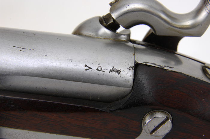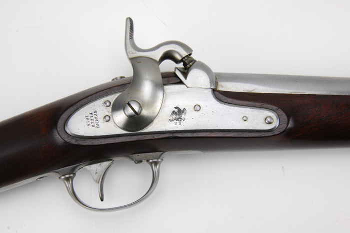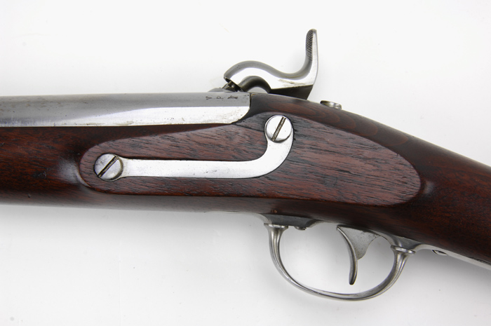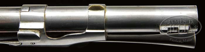 RARE SPRINGFIELD MODEL 1847 U.S. SAPPERS MUSKATOON. SN NSN. Cal. 69. 26″ Barrel is fitted with large double lug bayonet stud on right side of bbl near muzzle, and unique steel nosecap with corresponding large bayonet lug on right side. The nosecap engages another stud on top of bbl. This configuration is only found on this rare variation, and is so arranged to mount large brass hilted sword bayonet, made only for this model. Nosecap has large barleycorn brass front sight, and is stamped “19”. Muskatoon has original trumpet shaped steel ramrod. Typical 1842 model lock is stamped with eagle and “US” in front of hammer, and “Springfield 1855” behind. Only 80 of these muskatoons were produced by Springfield Armory in 1855. Total quantity of 830 were produced of which 228 were altered to Model 1847 artillery. A very scarce military long arm. Mr. Howard’s notes indicate that he acquired this item from Bill Huckaba in 1989. PROVENANCE: Robert Howard Estate Collection. CONDITION: Excellent, as refurbished. All metal parts are polished bright over some scattered pitting and marks. Stampings on bbl and lockplate are getting thin. Stock correctly refinished with some repairs around butt. No inspector’s marks are visible. Lock is crisp. 4-45431 MGM42 (5,000-8,000)