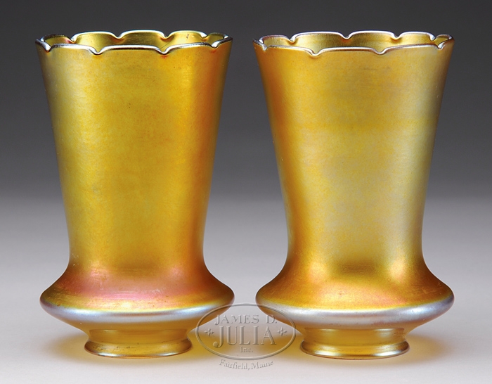 PAIR OF QUEZAL ART GLASS SHADES. Gold luster shades with scalloped top and blue highlights. Both signed on fitter “Quezal”. SIZE: 6-1/4″ t x 2-1/4″ fitter. CONDITION: Very good to excellent, one shade has minor pin nick to fitter. 5-66398 (200-400)