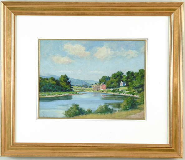 FRANK CONVERS MATHEWSON (American, 1862-1941) “KENT, CONN” LANDSCAPE. Fine watercolor scene shows bend in river with New England farmstead amongst tall green trees and pastures. Signed lower right “F .C. Mathewson 1924 Kent, Conn”. Fine gilt molded wood frame with gilt striped white matte. SIGHT SIZE: 11-1/2” x 15-3/4”. CONDITION: Very good. 9-95298 (1,400-1,800)