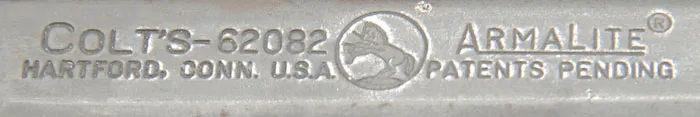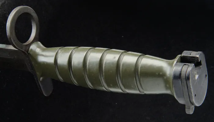 RARE PROTOTYPE M7 COLT ARMALITE BAYONET FOR THE AR15/M16. Prototype for the eventual production model of the soon to be famous rifle. It has an M4 style blade, 6-7/8” long with 3-1/2” of back grind marked on right side in two lines “COLT’S-62082 ARMALITE / HARTFORD, CONN. U.S.A. PATENTS PENDING”. There is the Rampant Colt in a circle in the center and the Armalite name is trademarked. It has a green composite handle with a dimple on right side of spacers. It has an M4 style latch but more squared across top. Handguard is from 1/8” stock with large ring for AR15/M16 flash hider. Accompanied by an M8 style Fiberglas sheath with metal throat painted OD with OD canvas belt loop and thumb strap with wire pistol belt hanger. It has its orig rawhide thong. See figure 424 in The Black Rifle M16 Retrospective, Stevens & Ezell. CONDITION: Near new with some rubs on the sides of blade. Sheath is also near new. 4-56732 JR471 (1,000-1,500)
