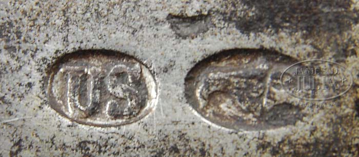 HARPERS FERRY 1803 FLINTLOCK. SN NSN. Harpers Ferry Model 1803 Type II rifle. NSN, Caliber .54, seven groove rifling, 33 inch half round/half octagon barrel having a V-notch rear sight mounted 8-1/2 inches forward of the breech and a brass sight mounted 1 ½ inches from the muzzle. The left top breech is stamped with a raised “US” and an eagle head over “P” in sunken ovals. The iron rib holds a brass ramrod pipe at the stock, with a middle iron pipe, a forward one also of iron that is slightly flared and retains the original iron ramrod. The trigger guard, forend 314stock band, side plate and patch box are brass having the proper latch device on the patch box operated from an iron button located behind the top brass butt plate screw. The lock plate is marked with an eagle facing the cock with a clear “US” within the shield on the eagle’s breast. Behind the cock in three lines is “HARPERS/FERRY/1816” reading vertically. Inside the lock are the initials “V/GM” and a numeral “3”. The original Black Walnut stock is nicely marked with the script ”JS” (James Stubblefield) and “AT” at tail of wood opposite the lock. Behind the trigger guard is “CL”. PROVENANCE: Robert Howard Estate Collection. Purchased from Bill Gerber in 1991. CONDITION: CONDITION: The metal is in very good original condition having been once lightly cleaned with the iron parts having a nice aged color but not a dark patina. The rifling is excellent. The stock is in very good condition, having been refinished with a coat of varnish, probably when some wood restoration around the butt plate tang was done. There is a 2 inch long x 1 inch wide area in front of the toe of the butt stock that has been replaced and a ½ inch long x 1 inch wide area in front and around of the butt plate tang that has also been replaced. The brass furniture is very nice and again showing its age but not dark. There is a 2 inch long stress crack along the side plate area that originates near the breech of the barrel and runs through the rear lock screw terminating just above the trigger pin. 4-45530 PAS5 (2,000-6,500)