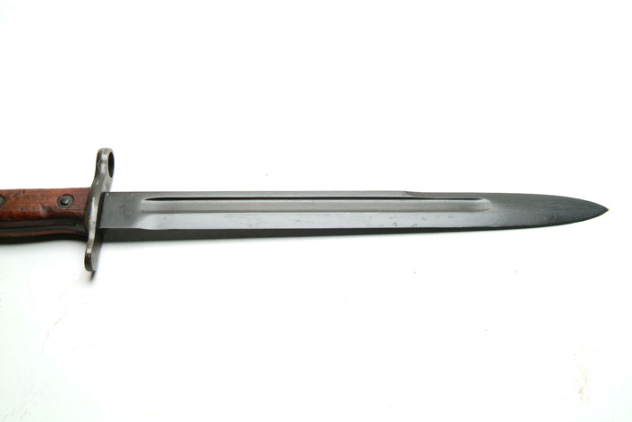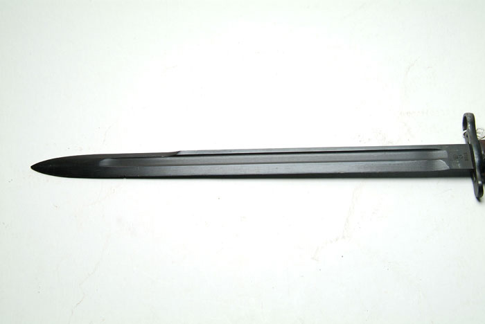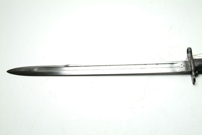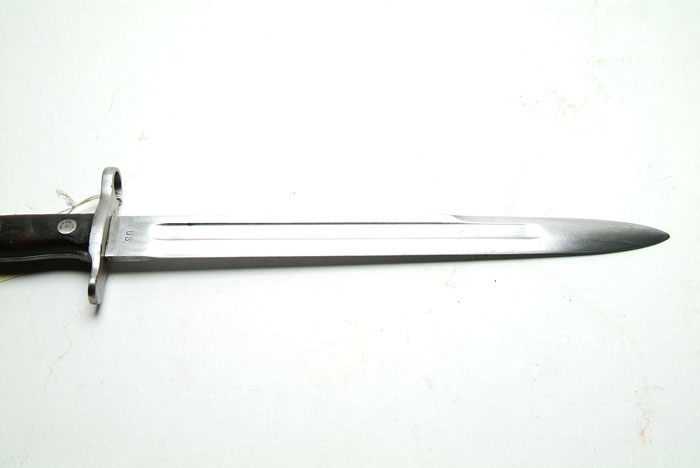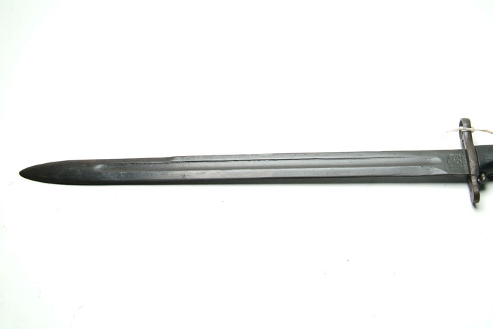 LOT OF 10 U.S. BAYONETS. 1) Krag Model 1892 Bayonet. Dated 1894 with Model 1892 scabbard. Fine to excellent with bright blade. 2) Krag Model 1892 Bayonet. Dated 1895 with Model 1898 scabbard. Very fine with bright blade and hilt, slight wear to scabbard. 3) Krag Model 1898 Bayonet with blue blade. Dated 1901 with 1898 scabbard. Fine with slight scuffing to the scabbard. 4) Krag Model 1898 Bayonet. Dated 1903 with wide loop scabbard. Excellent blade and hilt, some scuffing and pitting on the scabbard. 5) Springfield Armory. Model 1905 Bayonet. SN 72565. Dated 1906. This has been altered to the 1908 type with the roughened scales. The catch button is on the bottom of the grip and engages a hook on the iron throat of the leather scabbard. The upper portion of the blade is polished to white, while the lower ricasso retains the blue. There are some nicks in the edge of the blade. The hilt is fine. The scabbard has considerable scratching. The throat and wide belt loop are worn. 6) Springfield Armory Model 1905 Bayonet. SN 835456. Dated 1918. In canvas scabbard with metal throat and leather tip dated 1917. Blade and hilt are fine. The scabbard is somewhat soiled. 7) Springfield Armory Model 1905 Bayonet. SN 595747. Dated 1914, with “O” and “K” stamps on either side of the ordnance bomb. In canvas scabbard with metal throat and undated leather tip. Bright blade with blue on the ricasso with minor pitting and notches. The hilt has a brown patina. The scabbard is slightly soiled. 8) U.F.H. Model 1905 Bayonet. Dated 1942. Black plastic scales, metal throat, green plasticized scabbard. Reblued blade. Rust/brown patina on hilt. Slight wear on scabbard. 9) AFH Model 1905 Bayonet. Dated 1942. Metal throat on green plasticized scabbard. Light pitting overall with traces of finish on the ricasso. The brown plastic scales have some minor chips and bruises. The scabbard shows wear at the tip. 10) Springfield Armory Model 1905 Bayonet without scabbard. SN 875852. Dated 1916. Very heavy pitting with losses to the edges. Edwards Collection 4-58540 FS792 (1,000-1,500)