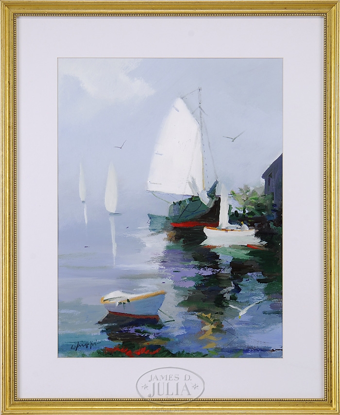 CHARLES C. GRUPPE (American, 1928-) “SCHOONER”. Acrylic on board morning scene shows a man in a small sailboat passing a large schooner with sail up and moored to dock. Three other boats are seen with seagulls and light sky. Signed lower left “C Gruppe”. Housed in a gilt wood frame with white matte. SIZE: Sight: 28″ x 21″. CONDITION: Very good to excellent. 9-97538 (500-800)