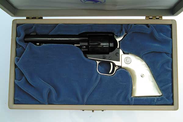 *COLT NEVADA CENTENNIAL FRONTIER SCOUT REVOLVER. Cal .22. Blue finish, with nickeled grip frame and triggerguard, and faux pearl medallion grips. Accompanied by its original gray, velvet lined wood case. SN2382NS. CONDITION: As new, probably unfired. Retains about all of its factory finish. No cylinder line. Box is equally new. 4-50198 JR552 (350-450)