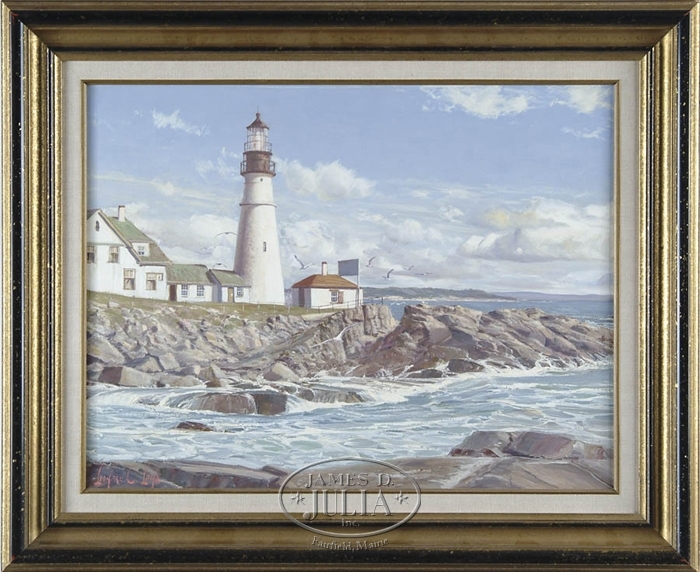 LEONARD C. LANE (American/Canadian, -1978) “PORTLAND HEADLIGHT”. Oil on canvas coastal scene shows a large white lighthouse with connected buildings having green roofs. It stands at the end of a rocky point with the Maine coastline beyond. Light blue sky with wispy white clouds and seagulls flying over rocks. Signed lower left. Housed in a good gilt and ebony color wood frame with linen liner. Exhibited at the Grand Central Gallery in New York City. SIZE: 20” x 26-1/4”. CONDITION: Very good. 9-27912 (2000-3000)