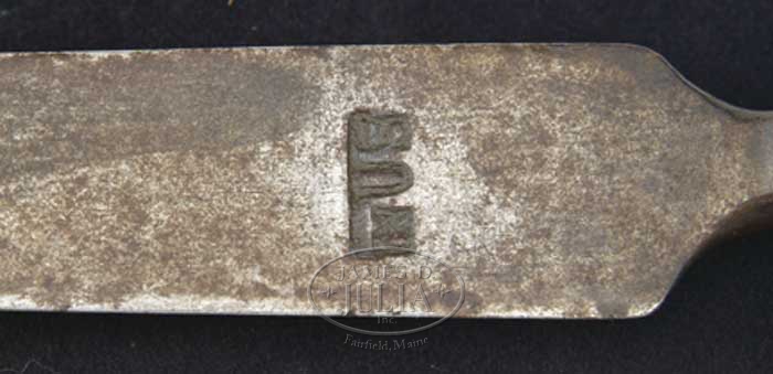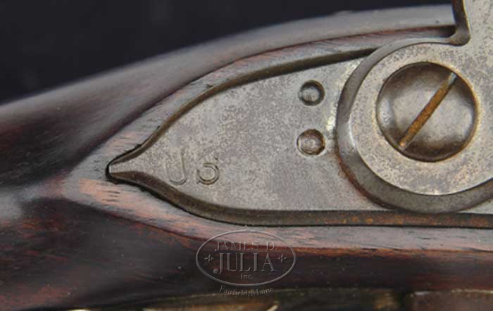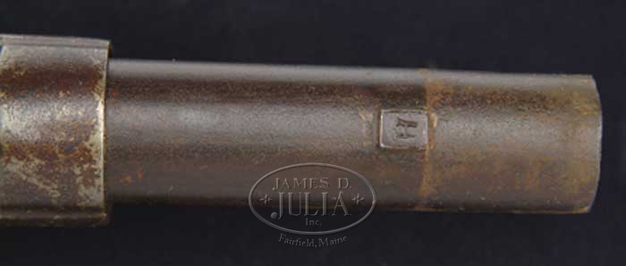 US SURCHARGED CHARLEVILLE FLINTLOCK MUSKET. Cal. 69. NSN Usual configuration with 44-3/4″ rnd bbl with bayonet lug on the top at the muzzle. It has 3 iron bands with split front band having a brass sight on the rear top. It has what appears to be a star and “D” proof mark at the breech end. Top tang has a “US” stamp with a matching stamp at the rear of the lock plate. Lockplate is about 6” long with a short teat at the rear with reinforced hammer and a “D” proof with “Charleville” in script in front of the hammer. Has iron furniture with a long lower tang and a smooth iron buttplate. Sideplate has an “AT” stamp. Mounted in a 1-pc walnut stock with a button head ramrod and is missing the sling wires. Appears to have had a very professional repair through the wrist. Accompanied by an orig, rare triangular socket bayonet, with a 15″ X 1-1/16″ triangular shaped blade with short narrow fuller near the tip and has what appears to be an “IN” proof along with a “US” surcharge. CONDITION: Very fine. Stock refinished and repaired as noted and retains most of this fine professionally restored finish. Couple of grain checks at the buttplate & a short crack in front of the lockplate. Metal is a dark attic patina with light to moderate rust. Mechanics are fine. Bayonet retains a matching patina with a lightly cleaned area on the back side. 4-55129 JR340 (3,000-5,000)