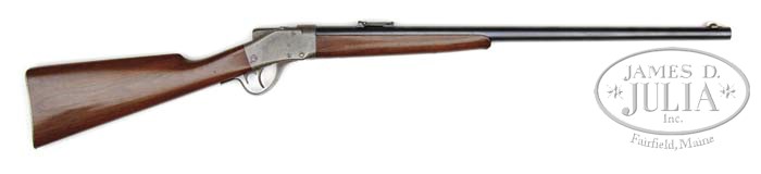 EXCEEDINGLY RARE SHARPS BORCHARDT HUNTERS RIFLE. SN 18281. Cal. 40-50 Sharps Straight. 26″ Round bbl is marked on top “Old Reliable” and “Sharps Rifle Co, Bridgeport, Conn.” and fitted with R. S. Lawrence patented, and so marked, rear folding ladder sight, and German silver blade front sight. Case hardened Borchardt action is marked with Sharps name and address, SN, and patent information on left side. Action has standard lever and trigger. Varnished plain American walnut buttstock is fitted with case hardened, heavily checkered, steel buttplate. Matching forend has schnabeled tip. The least expensive of the model 1878 civilian rifles, also the smallest and lightest. Frank Sellers in SHARPS FIREARMS states a total production of 62. How many have survived? PROVENANCE: Robert Howard Estate Collection. CONDITION: Excellent. Bbl retains 97 – 98% orig blue with some flecking and slight silvering. Action retains 80 – 90% orig case hardening color, faded somewhat overall, bright where protected on lever. Action screws retain most of their bright blue. Stocks are excellent, retaining nearly all of their bright varnish finish, with a few minor marks and spotting. A repaired 1-1/2″ x 1/2″ chip is on right side of buttstock behind action. Bore is excellent, shiny, with sharp rifling. Possibly the best example in existence. 4-45410 MGM56 (5,000-8,000)