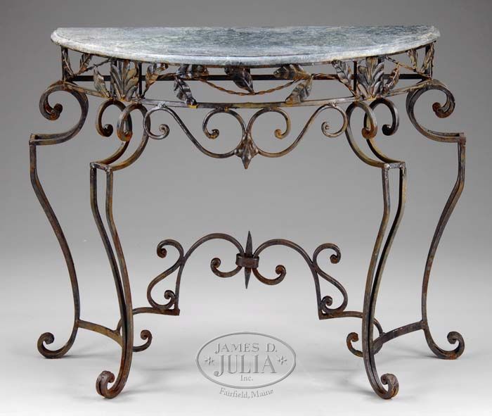 HALF ROUND IRON AND MARBLE GARDEN TABLE. Black painted iron base having scroll and leaf motif. Four scrolled legs with center S-scroll decorated stretcher and leaf vine decorated apron. Half round black mottled marble top. PROVENANCE: Fine private Long Island, New York mansion. SIZE: 33-1/2” h x 42” at widest. CONDITION: Some rust, marble has repairs, otherwise good. 9-74161 SM (500-800)