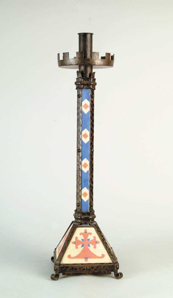 INTERESTING ARTS AND CRAFTS DECORATED TALL CANDLESTICK. Hand hammered metal frame with painted wood inserts. Large candle socket with castle top drip pan supported by a four sided tall column with inset colorful wood panels. Pyramid type base with painted panels all resting on four scroll feet. Unmarked. SIZE: 28” h. CONDITION: Only a few paint chips, very good. 9-94902 (200-400)