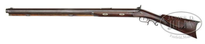J. C. E. KLEPZIG (SAN FRANCISCO) HEAVY BARREL TARGET RIFLE. SN NSN. Cal. 490. 8-Groove rifling. 34″ Heavy octagon bbl with muzzle turned for bullet starter (crown recess stamped “44”), is marked “Klepzig San Francisco” (listed at 212 Washington Street, 1858 – 60 and 763 Washington Street, 1861-65) on top left flat behind spring leaf screw adjustable semi-buckhorn rear sight. Bottom of bbl is fitted with 21″ rib mounting two steel beaded end thimbles, holding hickory ramrod with brass tip. Patent breech has nicely filed bolster with silver-plated line at front, top flat scroll engraved. Plain back action lock with flat serpentine hammer is marked “Klepzig”. Trigger plate is fitted with double set triggers. Dense American walnut stock attaches to bbl with two side nails through oval German silver escutcheons. There is another oval German silver inlay on toe line. Balance of the furniture is of iron with crescent buttplate, nicely filed bottom return, scrolled and spurred trigger guard, and ovate patchbox with fleur-de-lis finial on right side of butt. Left side of stock has nicely carved shadow line cheekpiece. Grip has 18 LPI point pattern flat top checkering with mullered borders. Mr. Howard’s notes indicate that he acquired this item from M. Luksich in 1987. PROVENANCE: Robert Howard Estate Collection. CONDITION: Fine. Bbl and lock retain a considerable amount of what appears to be orig plum brown finish, with some cleaning and filing evident at breech, which also had clean-out replaced with allen head screw. Stock appears to have an old rubbed oil finish over orig finish, checkering is considerably filled and worn. Edges of cheekpiece remain sharp. Stock furniture is silver gray to brown. Bore is very fine, mostly bright and shiny, with a few minor pits. Lock and set trigger are crisp. A high quality Western rifle. 4-45426 MGM107 (4,000-7,000)