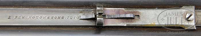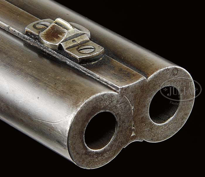 EXCEPTIONALLY RARE REMINGTON WHITMORE MODEL 1873 DOUBLE RIFLE. SN 1401. Cal. 40-50 Necked Sharps. 30″ Heavy de-carbonized steel bbls are stamped “E. Remington & Sons Ilion, N.Y.” on full length concave rib fitted with modified buckhorn sight with elevating slide. Screwed-on front sight base has German silver blade sight dovetailed through. Bbl flats are stamped with SN and “2” (Grade ?). Unique 1873 type action with monkey-tail lever and hammer retracting slide has all patent dates stamped into slide, as found on the earliest guns. Bar action sidelocks are fitted with non-rebounding high spurred hammers filed in a manner also unique to this model. Dense American walnut straight grip buttstock is uncheckered and measures 14″ over steel buttplate with spur. Matching splinter forend mounts to bbls with recessed side nail through oval steel escutcheons. Drop at heel: 2-7/8″, drop at comb: 1-1/4″. Weight: 14 lbs. 6 oz. LOP 14″. Accompanied by a 2-page hand-written letter dated “8-2-82” over the signature of Gordon Fosburg, addressed to Mr. Howard. Apparently Mr. Howard had written to Mr. Fosburg seeking his expertise on better identifying this dbl rifle. Mr. Fosburg writes that he does research on Remington firearms but has no specific information on dbl rifles. He does sight that in 1878 dbl rifles were listed as an option and in 1882 bbl inserts were offered. Apparently Mr. Howard was unable to find any additional information. PROVENANCE: Herb Glass 1982; Robert Howard Estate Collection. Voluminous copies of correspondence and further info regarding the history and sale of this rifle and its cartridge. CONDITION: Excellent. Bbls retain 60 – 70% of their orig very thin blue. Sights retain a considerable amount of their orig temper blue. Action retains most of its orig muted case hardening color. Lockplates and hammers retain over 90%. Stocks retain nearly all of their orig rubbed oil finish with numerous marks and scratches. Very thin wood toward front part of forend has numerous chips. Bores are very fine, mostly shiny, with strong rifling and a few scattered pits, mostly toward breech ends, and in right bbl. Action is tight. Locks are crisp. As fine an example of this very scarce Remington variant as one could ever hope to find. 4-45438 MGM21 (10,000-20,000)