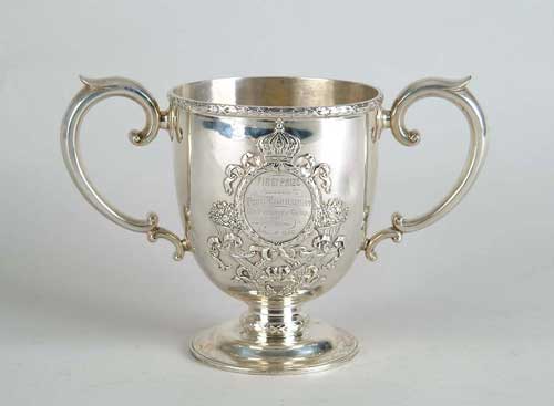 STERLING SILVER TWO HANDLED TROPHY CUP. Inscribed “First Prize Annual Pool Tournament University Club of St. Louis April 1st, 1898”. Footed cup has two C-scroll handles, oval presentation area surrounded by cornucopias and crown. Bottom marked “Sterling 2510”. Possibly by New Orleans Silversmiths. WEIGHT: 27 tr. oz. SIZE: 7” h x 11” w. CONDITION: One dime size dent to side, otherwise very good. 9-98183-1 (200-400)