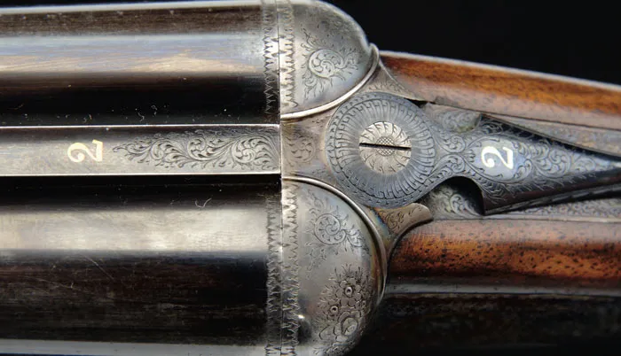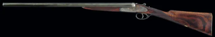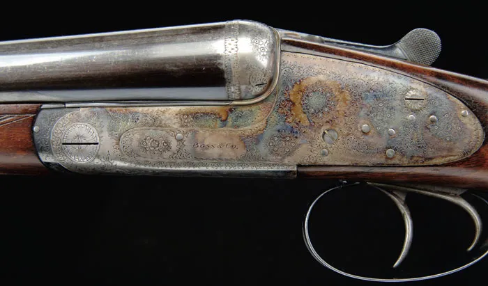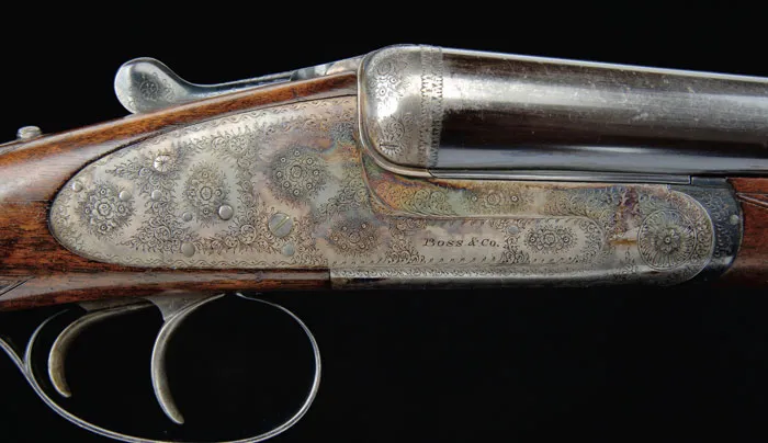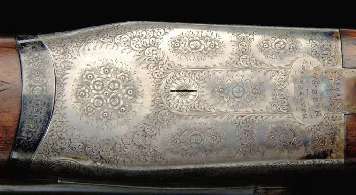 *BOSS BEST QUALITY DOUBLE BARREL SHOTGUN. Cal. 12 ga. SN 9236. Beautiful Boss double with 27” bbls choked IMP-CYL/IMP-CYL with tapered, concave, smooth rib, sgl bead, dbl chopper lumps, ejectors & dbl triggers. Mounted with extremely beautiful French walnut with checkered, rounded, splinter forearm & straight stock, 14-1/2” over a fine checkered butt. Receiver & lockplates are very beautifully engraved in English rose & scroll patterns with bouquets of flowers on lockplates, bottom of receiver, trigger plate & fences, surrounded by fine, foliate arabesque patterns. Appended metal is engraved to match. Bbl rib has maker’s name & a gold inlaid “2” with a corresponding number “2” on thumb lever & tip of forend iron. Top tang has “SAFE” in gold. Bottom of stock has a gold initial plate engraved “R.M.G.” Initials are for Mr. R.M. Gaylord of Rockford, Illinois. Mr. Gaylord was an enthusiastic hunter of waterfowl & lived near the Delta Marsh & was an equally enthusiastic supporter of the “Ducks Unlimited” organization, and in its early years was one of its first presidents. Bore diameter: left – .730, right – .729. Bore restrictions: left – .005, right – .005. Wall thickness: left – .025, right – .029. Drop at heel: 2-1/4”, drop at comb: 1-5/8”. Weight: 6 lbs. 6.4 oz. CONDITION: Very fine. Bbls retain 88-90% orig blue, strong & bright over forward half, thin on sides over forearm area. Receiver & lockplates retain most of their orig case colors, strong & bright in sheltered areas, especially on right side, thinning elsewhere & nearly silver on bottom front. Trigger guard retains 93-95% orig blue, thin on tang. Stock has a hairline back of top tang and another back of left lockplate, otherwise wood is sound with light handling & use marks with a small gouge on right side of buttstock & retains most of its orig oil finish. Mechanics are fine, brilliant shiny bores. 4-60378 JR643 (35,000-45,000)