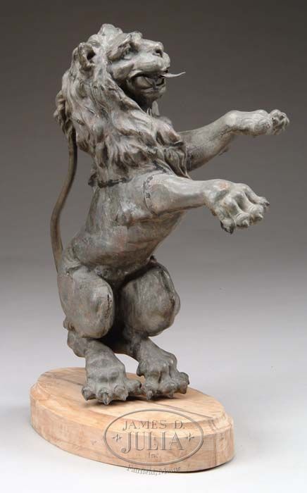 ZINC GARDEN FIGURE OF A RAMPANT LION. Well mottled lion with open mouth and protruding tongue has curled up tail which reaches mane and large claw feet in a classic rampant stance. 19th Century. Mounted to a rod which attaches to a beveled edge oval wood platform. SIZE: 28” h x 24” l. CONDITION: Very good, tongue has split. 9-71022 LG (5,000-10,000)