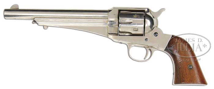 REMINGTON MODEL 1875 SINGLE ACTION ARMY REVOLVER. SN 616. Cal. 44 WCF (44-40). Nickel finish with 7-1/2″ bbl, full front sight and 1-line “E. REMINGTON & SONS” address. Mounted with 2-pc smooth walnut grips matching numbered on inside of each grip. According to Flayderman’s Guide to Antique American Firearms there were only about 25,000-30,000 of these fine revolvers produced in the period 1875-1889. The Remington Army was a fine revolver in its day and would have been serious competition for the Colt Model 1873 but it appeared on the market two years after the Colt, by which time Colt was well established with military contracts which Remington could never generate. Even though the Remington was every bit the equivalent of the Colt, Remington did not have the distribution and contacts to reach widespread customers. It is believed that there was a contract for 10,000 of these revolvers by the Egyptian government but apparently only a few were delivered. The government of Mexico purchased about 1,000 of them. PROVENANCE: Don Littman; Robert Howard Estate Collection. CONDITION: Extremely fine. Overall retains just about all of its strong orig nickel finish with some faint muzzle edge wear, slight wear on ejector rod head and light dulling from handling; screws retain most of their orig fire blue; grips are sound with a couple of gouges & bruises, moderate edge wear and retains most of their orig varnish. Mechanics are fine, bright shiny bore. 4-45223 JR106 (4,000-7,000)