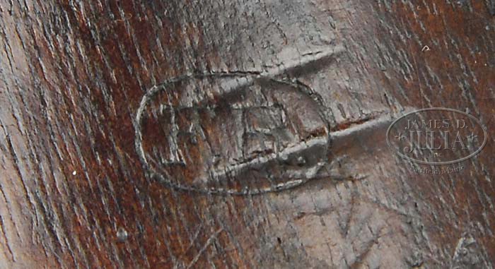 SCARCE REMINGTON MODEL 1875 EGYPTIAN CONTRACT SINGLE ACTION REVOLVER. SN 754. Cal. 44 Remington. Blue finish with 7-1/2″ bbl, pinched post front sight and E. REMINGTON & SONS” 1-line left hand address. Left side of bbl is stamped with a small 5-pointed star at the frame and upper left side of bbl boss is stamped with an “R”. Buttstrap is mounted with a sling swivel and it has 2-pc smooth walnut grips with an oval “FR” (Cdr. Frederick Rodgers) cartouche on left side. Grips are matching numbered to this revolver in pencil inside each grip. This revolver is part of a reported 10,000 gun contract for the Egyptian government which, reportedly, only a few revolvers were delivered. The few existing Egyptian Contract revolvers usually show hard use without much orig finish. PROVENANCE: Ron Ogan; Robert Howard Estate Collection. CONDITION: Fine to very fine. Bbl retains 75-80% strong orig blue with the loss areas mostly flaked, not worn to a dark patina; there are a few small scratches on right side; ejector housing web retains 85-90% strong orig blue; frame retains traces of orig blue having flaked, not worn, to a dark patina; trigger guard retains about 80% blue with the front & back straps blue/gray patina; cyl retains 70-75% orig blue; hammer retains strong, bright case colors on sides & rear edge, faded to silver on top edge; grips have a chipped left toe and show moderate to heavy wear with several gouges, nicks & bruises and retain a dark oil finish. Hammer is without half cock, otherwise mechanics are crisp, brilliant shiny bore. 4-45224 JR107 (6,000-10,000)