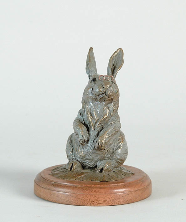JAMES STARKEY (American, 20th Century) PROFESSOR RABBIT. Bronze sculpture shows small rabbit seated wearing spectacles. Signed on side and limited edition 22/500. Mounted on a round molded edge walnut base. OVERALL SIZE: 6-1/4”. BRONZE: 5-1/4” h. 9-95501 (150-250)