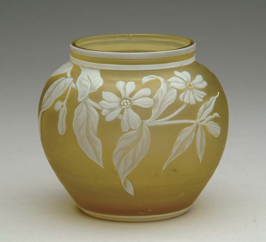 WEBB CAMEO VASE. Nice squat vase has beautifully detailed white cameo flowers and leaves as well as a lovely butterfly all against a light amber background. Marked on the underside “Thomas Webb & Sons Cameo”. SIZE: 3-1/4 in. t. CONDITION: Small flake to outside of top rim and tiny fleabite to inside of rim, otherwise very good. 5-61567 (500-700)