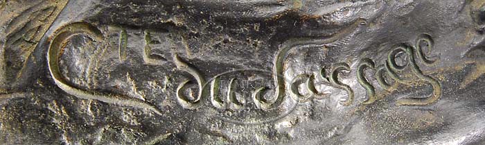 COUNT ARTHUR MARIE GABRIEL DU PASSAGE (French, 1838-1909) SETTER. Fine bronze sculpture of a dog holding a snipe in its mouth standing on a naturalistic rock with vegetation. He holds one paw off the ground in retrieval stance. Signed “Cte du Passage”. Blackish/brown patina on a nice antique bronze. REFERENCE: Full page illustration, page 273 in “Les Animaliers” by Horswell. SIZE: 14-3/4″ h x 16″ l. CONDITION: Very good. 9-95295 (2,500-3,500)