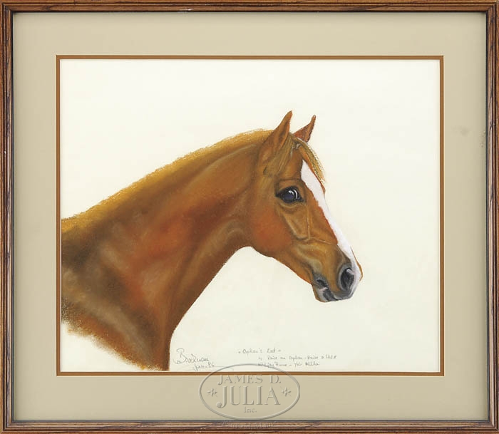 SIGNED (American, Late 20th Century) “ORPHANS LAST”. Pastel study of a horse’s head. Pencil signed and dated “Jan 86”. Also inscribed “Orphans Last by Raise au Orphan-Raise a Native out of Gay Femme-Yow Alishai”. Housed in a wood frame with double matte. SIZE: Sight: 16-1/2″ x 20″. PROVENANCE: Estate of Henry A. Rudkin Jr, (family of the founders of Pepperidge Farm). CONDITION: Very good. 9-98940 (400-600)