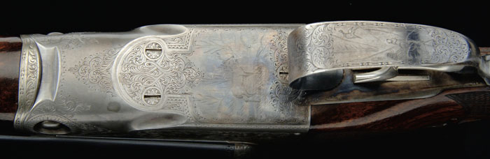 *SCARCE PRESENTATION PARKER BHE GRADE DBL BBL SHOTGUN. Cal. 20 ga. SN 150571. Built on an “O” frame with 26″ Acme steel bbls choked FULL/FULL with matted rib, sgl bead, and doll’s head extension, ejectors & dbl triggers. Wood is beautifully grained English walnut with checkered splinter forearm & straight stock with raised fleur-de-lis side panels, 14-3/8″ over a skeleton buttplate with checkered center. Left side of the stock has a rare & unusual half moon checkered area on the cheek piece & a gold initial plate by the toe. Right side of the stock is inlaid with a 1-3/8″ x 1-1/8″ silver shield inscribed “PRESENTED TO / EDGAR L. APPERSON / BY / AUTOMOBILE DEALERS / ASS’N of SOUTHERN / CALIFORNIA / 1909”. Receiver is engraved with two bird dogs on point on each side & a standing stag in a woodland scene on the floorplate. Trigger bow is engraved with a vignette of a pointer on point & a flying pheasant in a field scene. Accompanied by a Parker letter indicating that it was shipped June 18, 1908 to Tufts Lyon Arms Co. of Los Angeles, CA. It identifies this shotgun as having a 14-1/2″ LOP with straight grip and weighed 6 lbs. 2 oz. Letter also indicates a silver inlay on the stock “LARGE ENOUGH TO PUT ON 8 NAMES”. Price was $225.00. No mention is made of the checkered panel on the left side of the stock. Drop at the heel 2-3/8″, drop at the comb 1-3/8″. Weight: 6 lbs. 2.2 oz. CONDITION: Very fine plus. Bbls retain 96-98% strong orig blue with minor light muzzle edge wear & light wear under the forearm. Receiver retains 65-75% thin orig case colors, strong in the sheltered areas with the balance turned silver. Wood is sound and retains most of a professionally restored finish. Mechanics are crisp, bright shiny bores. 4-60274 (22,500-27,500)