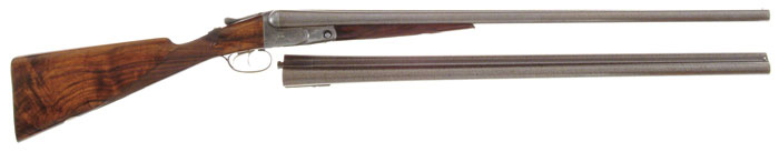 *PARKER CHE GRADE DAMASCUS DOUBLE BARREL SHOTGUN 2-BARREL SET. Cal. 12 ga. & 16 ga. SN 119760. Built on a No. 1 frame with two sets of 28” Bernard Steel bbls. 12 ga. bbls are choked MOD/MOD (and were added at a later time to the gun) and 16 ga. bbls are choked FULL/IMP-CYL. Both have tapered, concave, matted rib with sgl bead, doll’s head rib extension, ejectors & receiver has dbl triggers. There is one forearm. Mounted with highly figured, streaky, French walnut with checkered splinter forearm & straight stock with teardrop side panels, 14” over a checkered, skeleton buttplate. Bottom of stock has a blank silver initial oval secured with six silver pins. Receiver is beautifully engraved with small vignettes of a pointer on left side, a setter on right side & large vignette of a running bull elk on floorplate, surrounded with light coverage, very beautiful foliate arabesque patterns. 12 ga. BBLS: Bore diameter: left – .730, right – .730. Bore restrictions: left – .019, right – .015. Wall thickness: left – .029, right – .030. 16 ga. BBLS: Bore diameter: left -.664, right – .664. Bore restrictions: left – .016, right – .000. Wall thickness: left – .023, right – .026. Drop at heel: 2-3/8”, drop at comb: 1-3/8”. Weight with 16 ga. bbls: 6 lbs. 11.52 oz. Listed in the Parker Gun Identification & Serialization book as a B4 Grade, hammerless with ejectors & straight stock in 16 ga. with 28” bbls. B4 Grade is a C Grade gun with Bernard Steel bbls. CONDITION: Very fine. Both bbls retain about all of a beautiful professionally restored finish with bright Damascus patterns. Receiver retains case colors in the most sheltered areas, being faded, silvered case colors overall. Trigger guard is a silver/gray patina. Stock has a hairline back of top tang with a tiny hairline at back edge of forearm, otherwise wood is sound and retains most all of a fine professionally restored finish with some light creases in finish on buttstock. Mechanics are fine, bright shiny bores with some very faint orange peel effect just in front of chambers on both sets of bbls. 4-59227 JR553 (8,000-12,000)