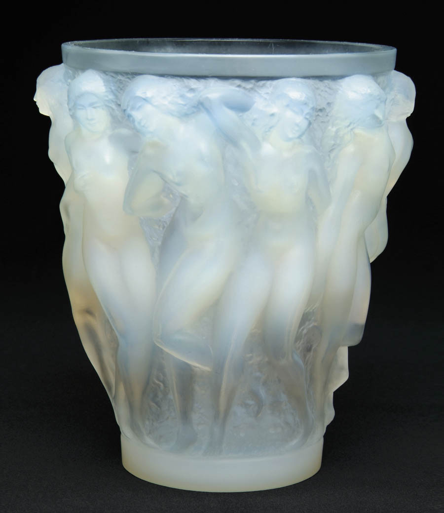 LALIQUE OPALESCENT BACCHANTES VASE. Exceptionally rare Bacchantes vase is encircled by dancing nudes and is done in a rich opalescent glass with flashes of blue and amber. Signed on bottom of foot “R. Lalique France”. SIZE: 9-1/2″ t. CONDITION: Foot has been reduced which has partly removed signature. Small feather at lip from mfg. 5-62432 (15,000-18,000)
