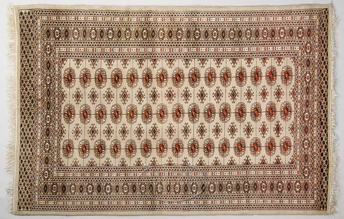 INDO-BOKHARA RUG. Late 20th century. Of typical form, having three rows of 15 guls interspersed with angular latch hook medallions on a beige field within multiple stripe borders of geometric designs, all in polychrome earth tones. SIZE: 6’2″ x 4’2″. CONDITION: Very good overall. 9-90564 (150-250)