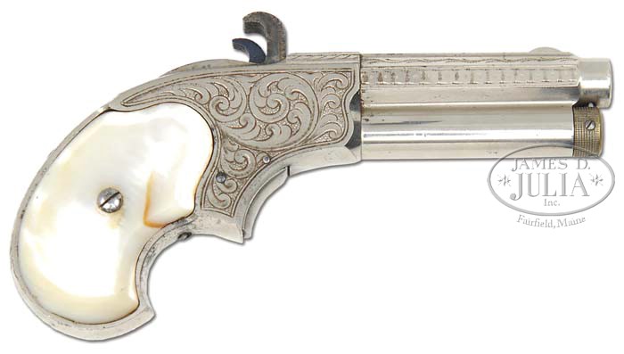 REMINGTON RIDER MAGAZINE PISTOL. SN NSN. Cal. 32 RF Extra Short. Nickel finish with 3″ oct bbl, half moon front sight and 2-line address with magazine below. Mounted with 2-pc smooth pearl grips. Pistol is very nicely engraved, probably from the L.D. Nimschke shop with full coverage on the frame & backstrap with running vine patterns on top side flats of bbl and square & dot patterns on side flats. Breech block is color case hardened with fire blued hammer. PROVENANCE: Herb Ratterley (1984); Robert Howard Estate Collection. CONDITION: Extremely fine, probably unfired. Overall retains most of its brilliant orig nickel finish with bright case colors on breech block and bright fire blue on hammer with the only losses some minor flaking on front strap; grips are sound and retain great fire. Mechanics are crisp, brilliant shiny bore. 4-45309 JR143 (3,000-5,000)